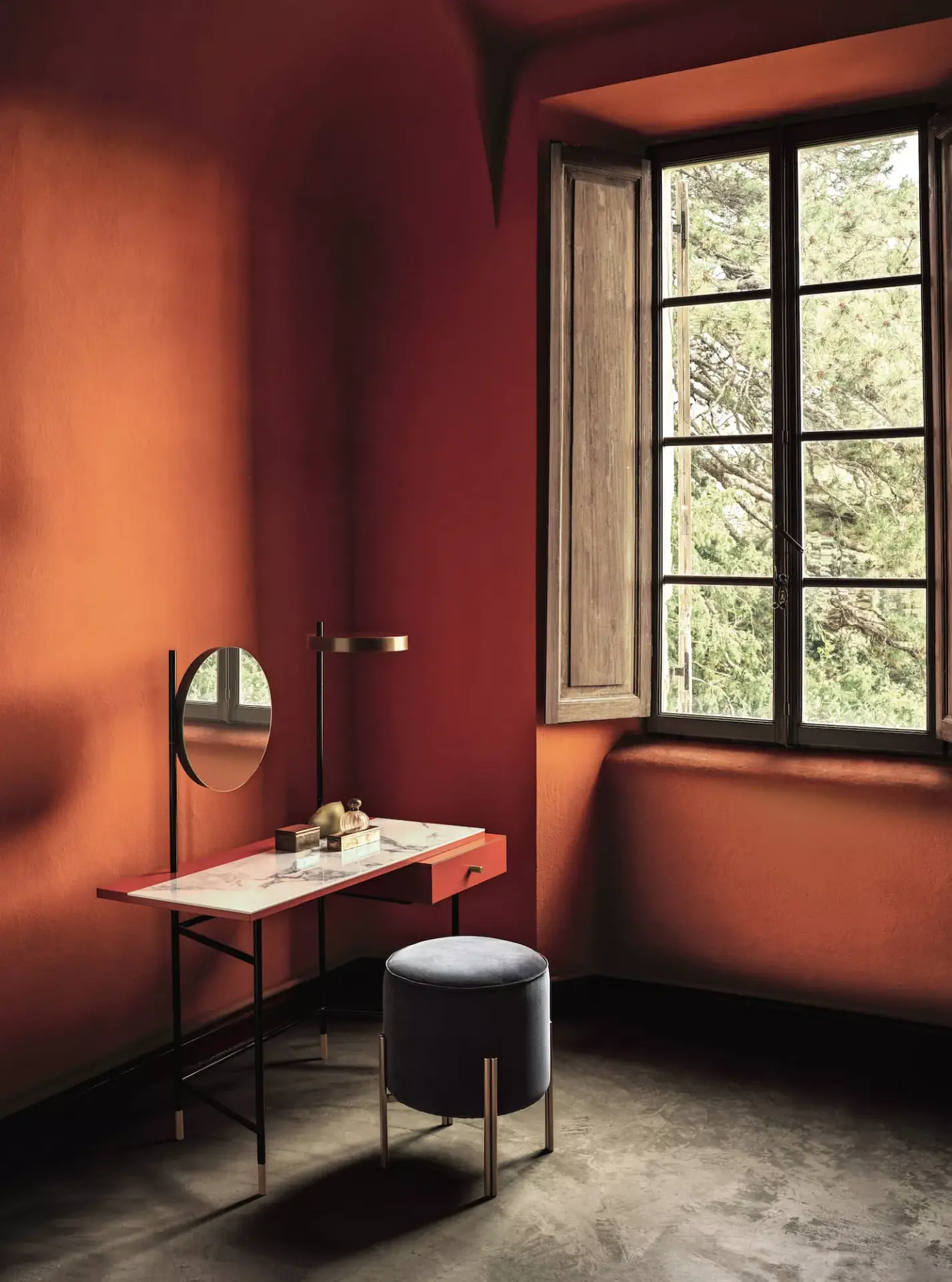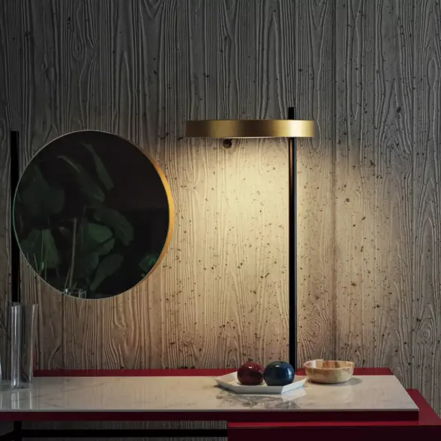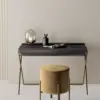 Scrittoio in versione con specchio e luce orientabili, solo specchio o solo scrittoio. struttura in Acciaio laccato. Dettagli decorativi (piedini, maniglia cassetto e supporti specchio e luce) in Acciaio laccato. Piano e cassetto in melaminico.