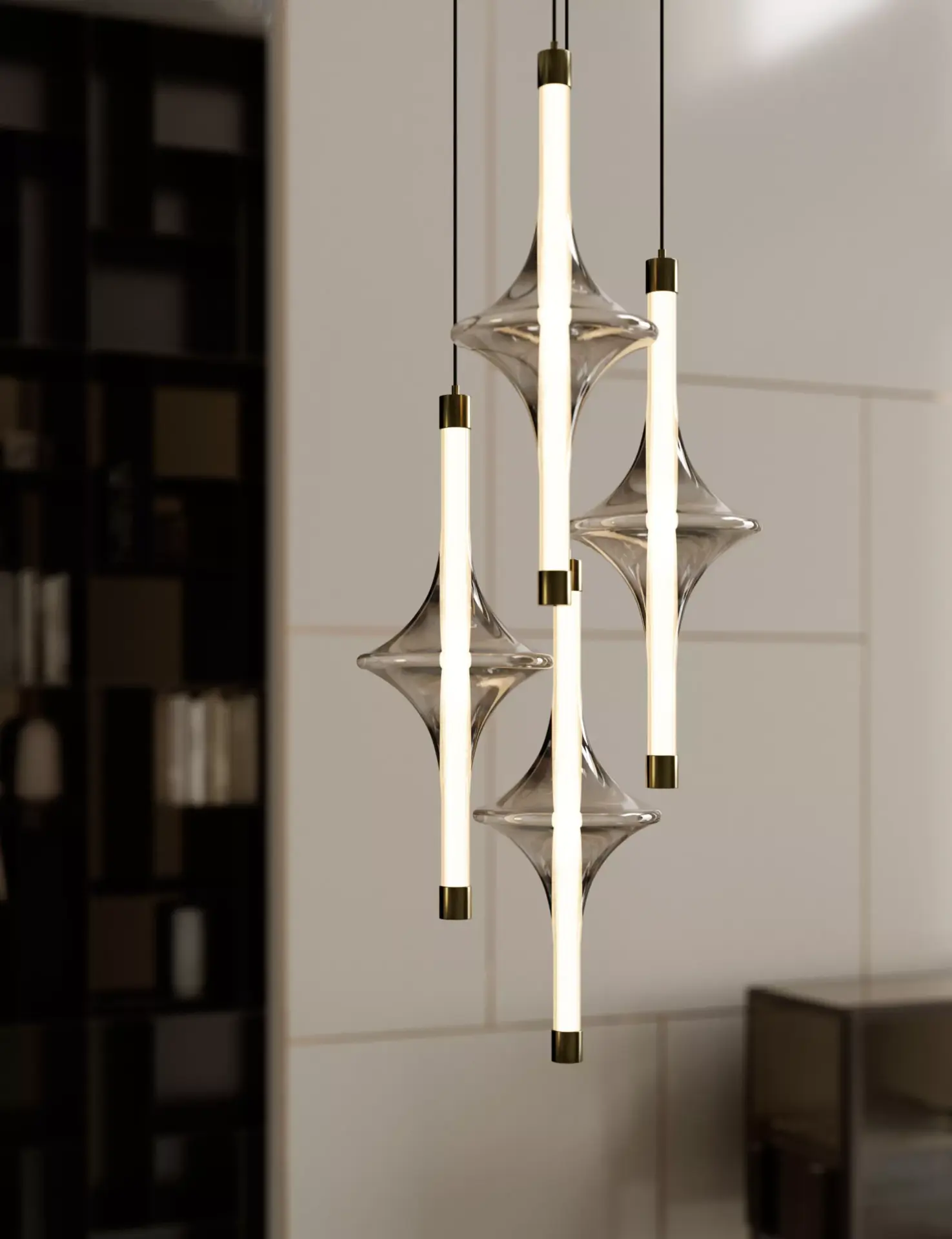 Lampada a sosponsione con struttura in ottone naturale con vetro borosilicato fumè esterno e millerighe interno.