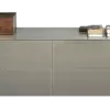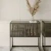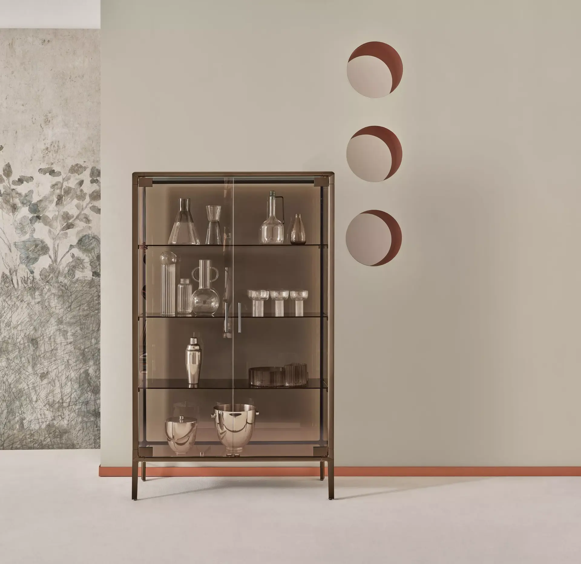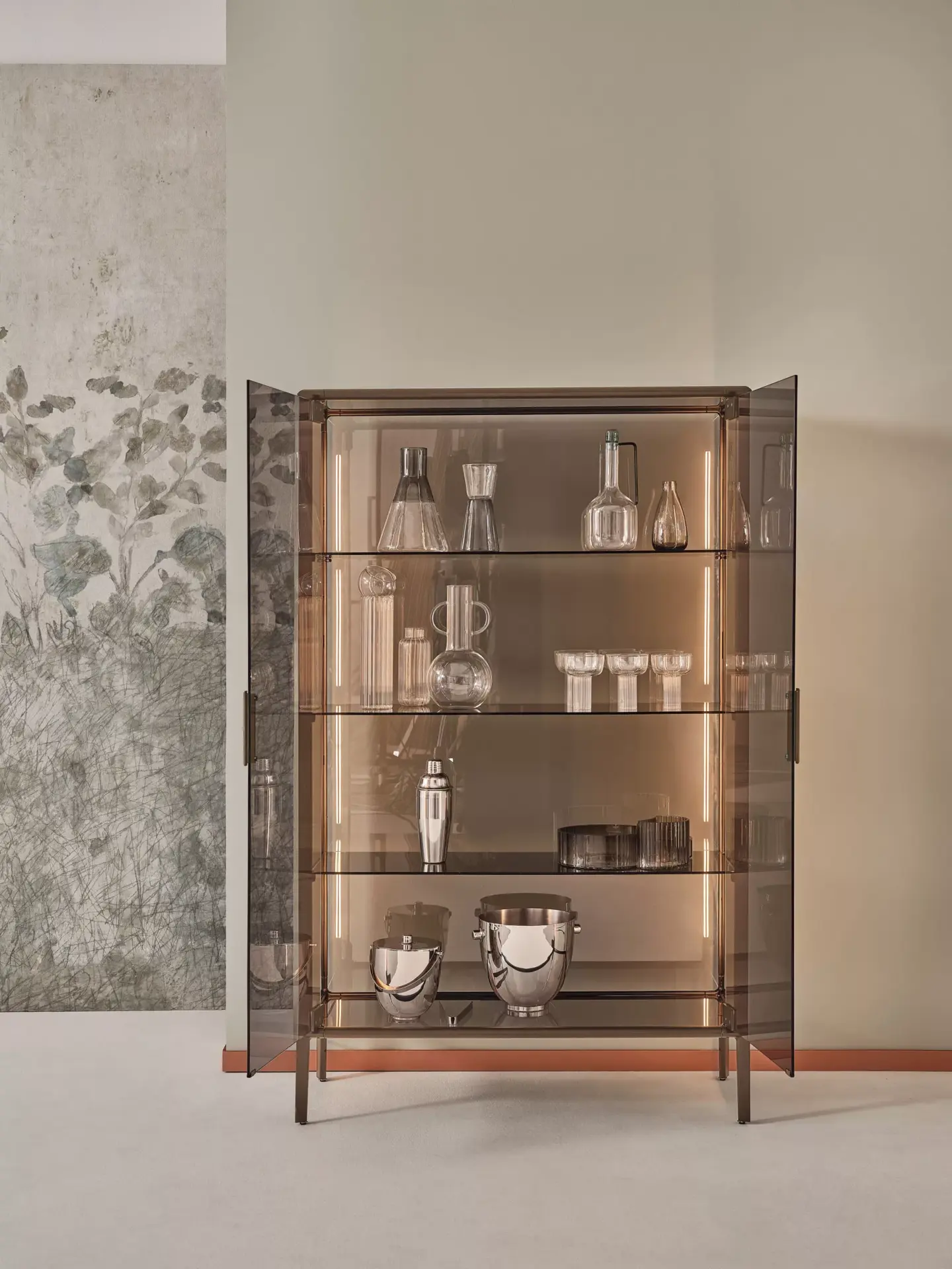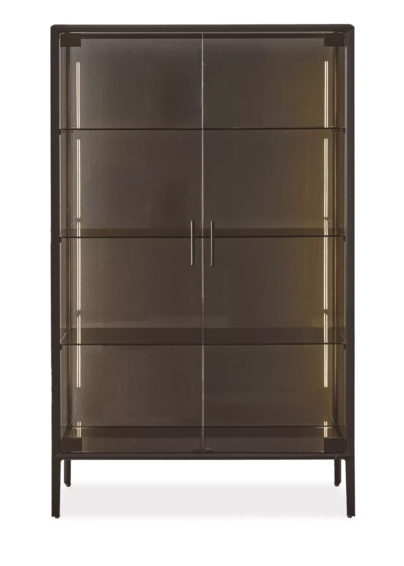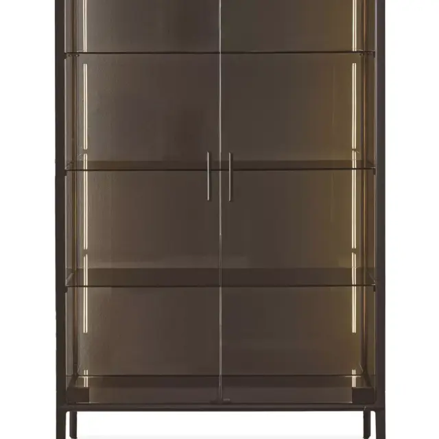 Vetrina con struttura in alluminio composta da due ante battenti e n.3 ripiani interni in cristallo. Struttura, piedini e maniglie in alluminio laccato ottone scuro.