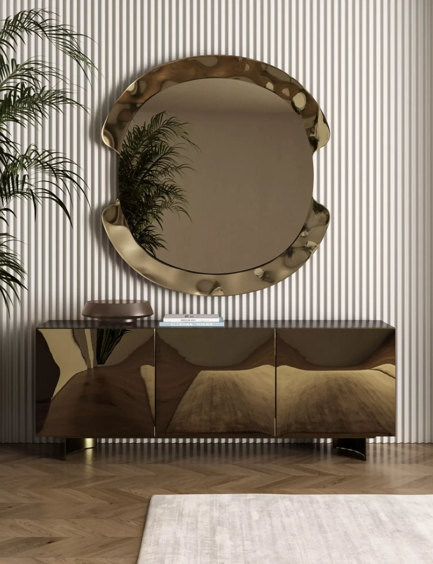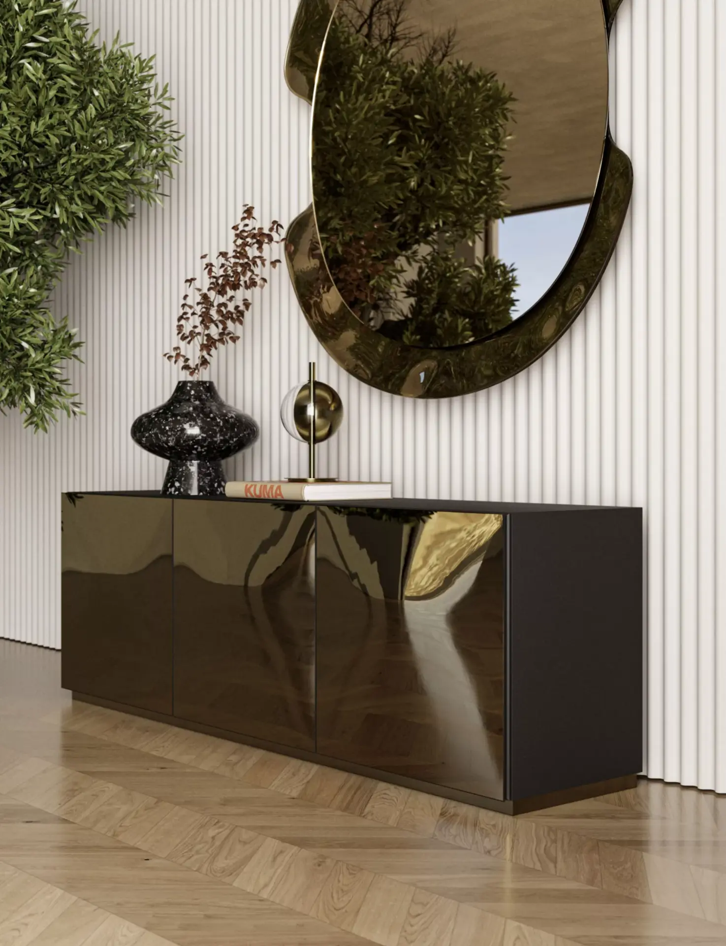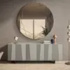 Madia con struttura in legno composta da ante a battente, ripiani interni in cristallo trasparente, fianchi in legno laccato e ante in Specchio Bronzo e Specchio Fumè. A scelta con zoccolo o piede in acciaio.