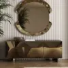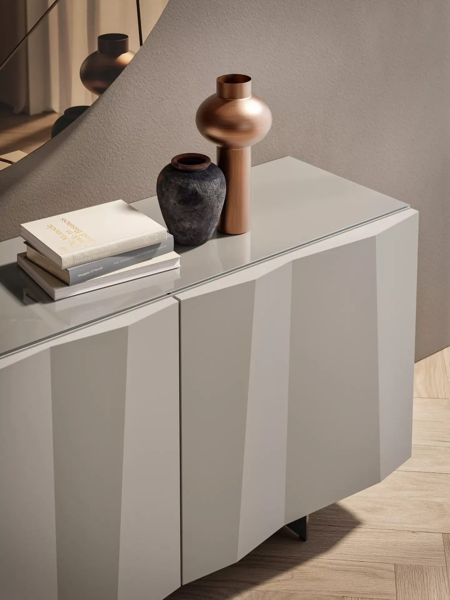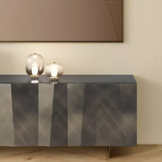 Madia con struttura in legno, ripiani interni in cristallo trasparente. Top in cristallo trasparente extrachiaro e cassetto specchiato opzionali.