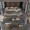 Tavolo rettangolare e a botte, fisso o allungabile, con struttura e dettagli decorativi in Acciaio laccato. Piano in legno impiallacciato, legno massellato, legno massello scortecciato, Cristallo, Cristallo Antigraffio, SuperCeramica e SuperMarmo.
