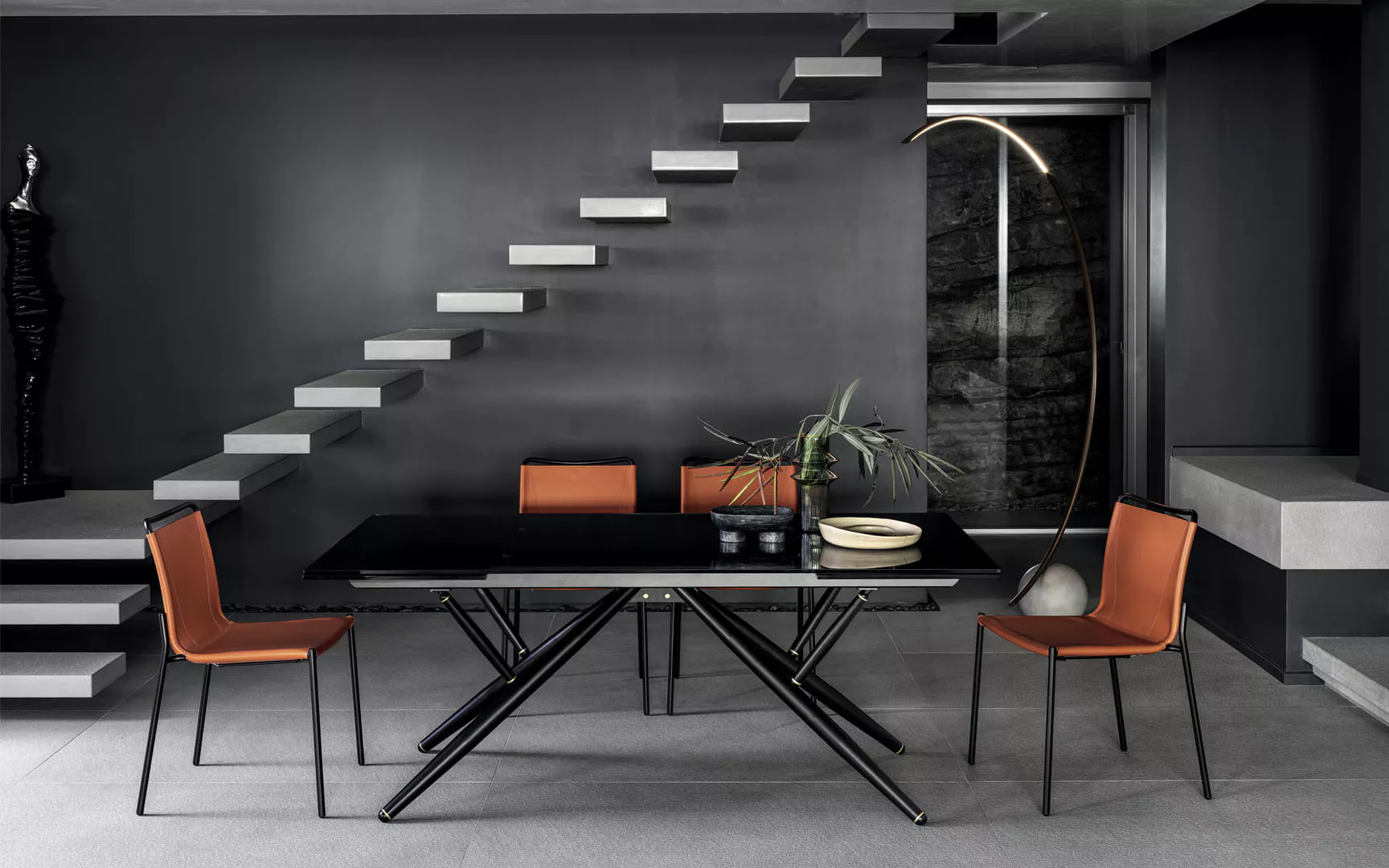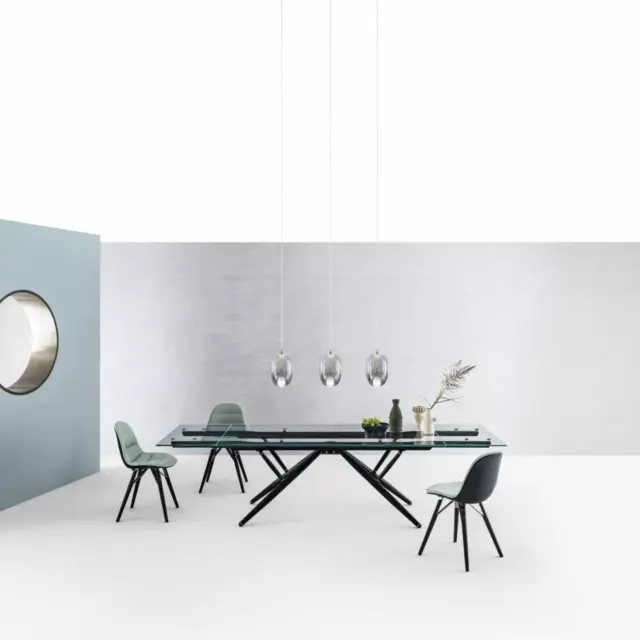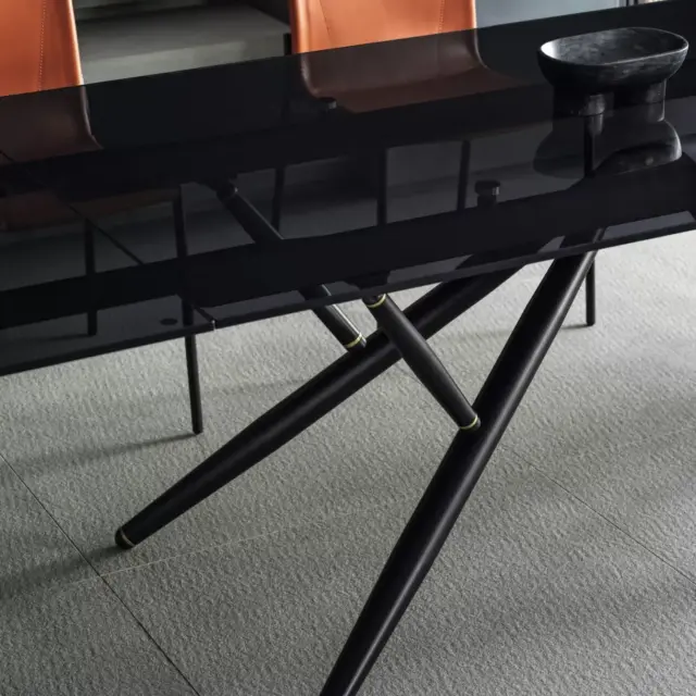 Tavolo rettangolare e a botte, fisso o allungabile, con struttura e dettagli decorativi in Acciaio laccato. Piano in legno impiallacciato, legno massellato, legno massello scortecciato, Cristallo, Cristallo Antigraffio, SuperCeramica e SuperMarmo.