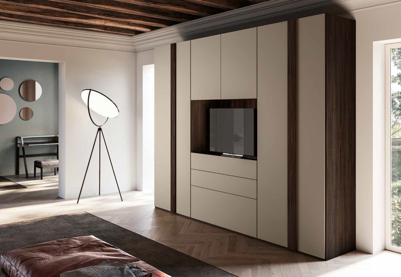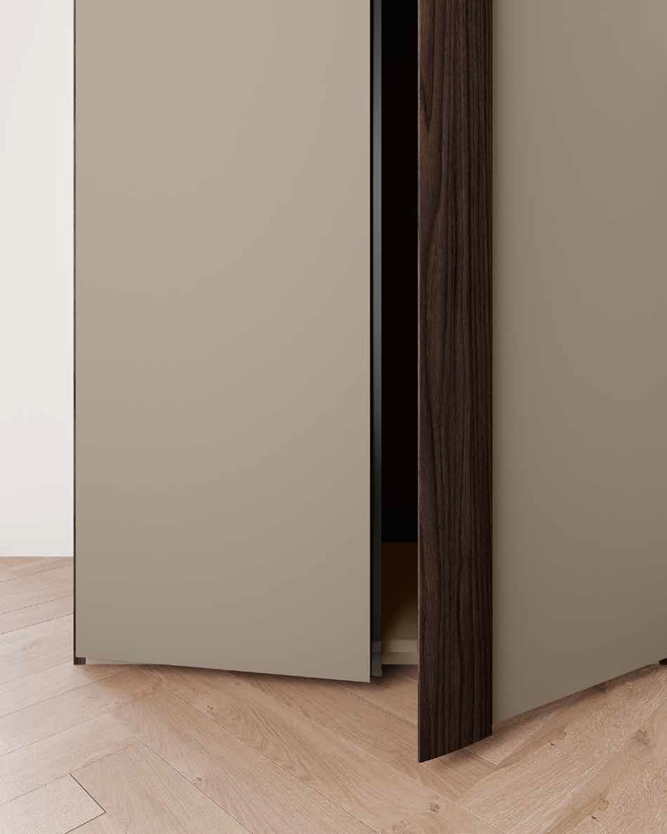 La struttura in noce moro si abbina alle ante in noce moro e visone, creando un raffinato contrasto cromatico.