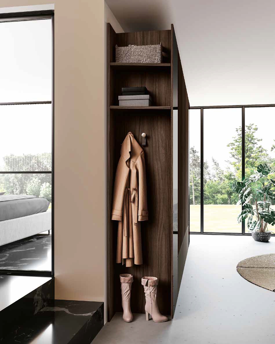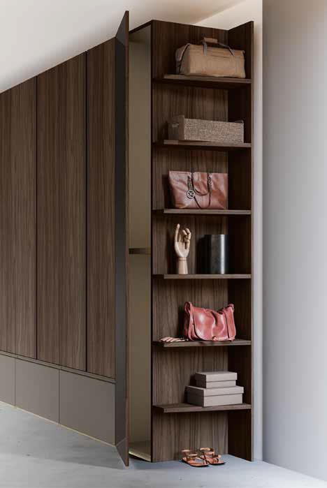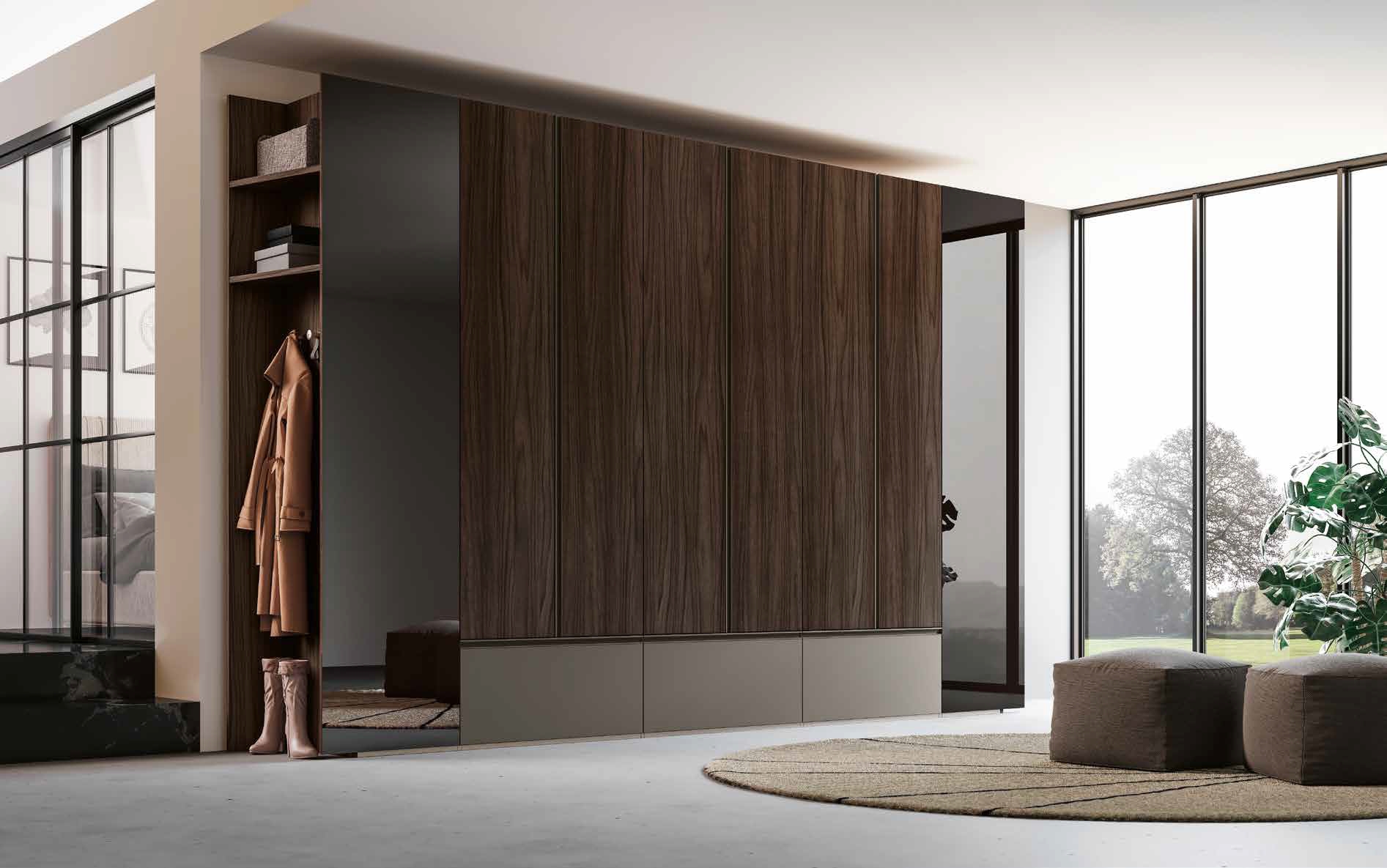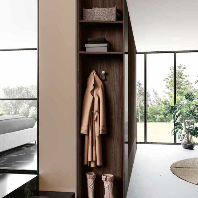 La struttura in noce moro trasmette calore e pregio, mentre le ante in specchio fumé aggiungono un tocco moderno e sofisticato.