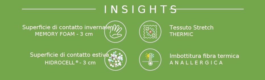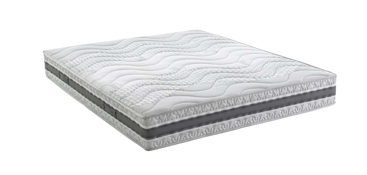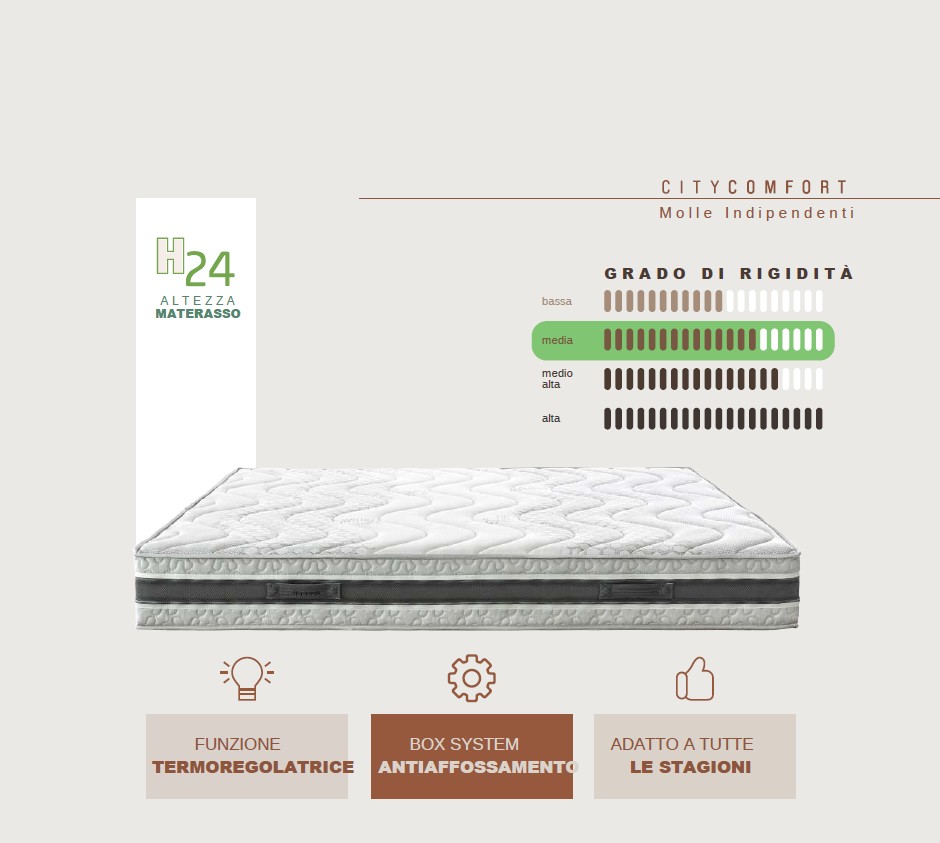 Il modello Stoccolma è realizzato con un box system avente una superf ice in Memory e l’opposta in Hidrocell ®, per poter adattarsi sia alla stagione invernale che a quella estiva, poliuretano antiaffosamento perimetrale e un cuore in micromolle (1600 molle nella versione matrimoniale) indipendenti ad elevatissima adattabilità corporea. Il rivestimento in tessuto THERMIC con funzione termoregolatrice e la f ibra termica anallergica completano un prodotto innovativo e strutturalmente solido.